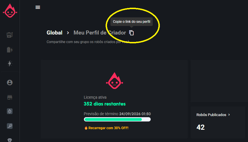 O usuário entra, vê só os seus robôs, assina e opera direto na sua plataforma.